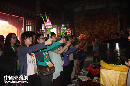 臺灣學生手持鮮花參拜孔子像。(圖片來源:泰安市臺辦)