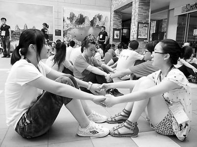 當(dāng)天是“四川學(xué)生臺(tái)灣風(fēng)情夏令營(yíng)”的交流破冰之日,近百名川臺(tái)學(xué)生一起做團(tuán)體游戲,其中有個(gè)游戲叫做“大家站起來(lái)”,最受同學(xué)們的喜愛(ài)。游戲方法是先讓兩個(gè)人相對(duì)而坐,試著讓雙方同時(shí)站起來(lái),然后逐漸增加人數(shù),4人、10人、20人,直至所有人圍坐成一個(gè)圓圈站起來(lái)。