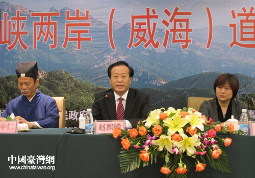 中國臺灣網9月19日文登消息 9月18日,第三屆海峽兩岸(威海)道教文化研討會開幕式及專題演講在文登市舉行。來自海峽兩岸的道教界人士齊聚一堂,圍繞道與自然、道教養生與身心健康、弘揚道教優秀文化促進社會健康發展等議題進行交流研討。威海市委副書記趙熙殿出席研討會并講話。國臺辦交流局處長田曉玲、山東省道教協會會長劉懷元專程來威海參會。臺灣正宗全真道教會理事長巫平仁先生率團來威,并展示了一套全真道教太極養生拳。