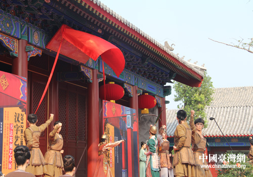 中國臺(tái)灣網(wǎng)9月20日棗莊消息 近日,第三屆兩岸漢字藝術(shù)節(jié)在山東省棗莊市舉行,臺(tái)灣漢唐樂府一行70余人前來助興表演,給兩岸游客上演了一場穿越時(shí)空的“藝術(shù)盛宴”。置身其中,仿佛時(shí)光倒轉(zhuǎn)。表演將觀眾從嘈雜的塵世中帶進(jìn)了遙遠(yuǎn)的漢唐時(shí)代,讓觀眾與漢唐壁畫中的仕女們進(jìn)行了一次清新地交流。