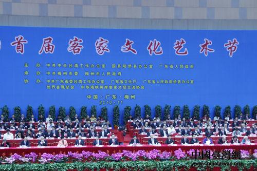 中國臺灣網11月24日廣東梅州消息 由中共中央臺灣工作辦公室、國務院僑務辦公室、廣東省人民政府共同主辦,梅州市委、市政府承辦的首屆客家文化藝術節,23日上午在梅州市隆重開幕。廣東省省長朱小丹、中國國民黨榮譽主席吳伯雄、海協會會長陳云林等,與來自海內外的2000多名客家鄉親及梅州市群眾代表共7000多人出席開幕式。