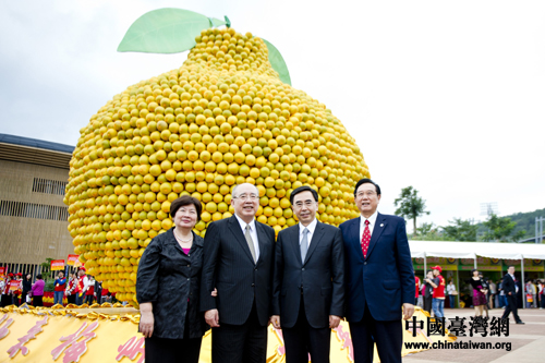 首屆客家文化藝術節開幕式后,朱小丹、吳伯雄、陳云林及吳伯雄夫人在客商產品展銷會合影(中國臺灣網發 高訊 攝)
