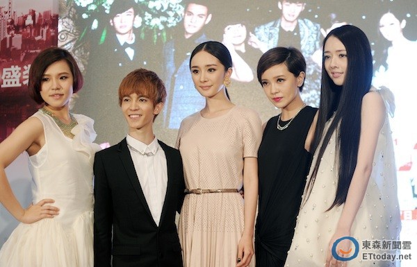 《小時代》幾位主要演員謝依霖(左起)、導演郭敬明、楊冪、郭采潔以及郭碧婷。