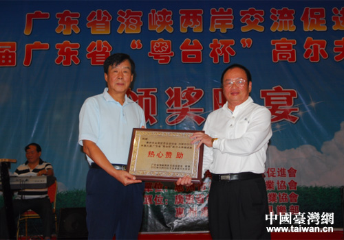 促進會副會長白瑞秋向承辦單位惠州市臺協贈送了感謝牌匾。省臺辦副主任、促進會常務副會長陳林佐主持見證了“粵臺杯”會旗交接儀式,他期望下一屆承辦單位汕頭市臺協、潮州市臺協、肇慶市臺協、云浮市臺協將下屆“粵臺杯”高爾夫球賽辦得更好。