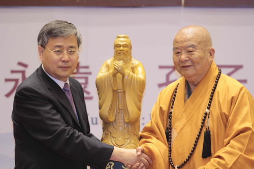 郭樹清說,山東是孔子故鄉(xiāng),孔孟文化代代相傳,在社會(huì)文化中發(fā)揮重要作用。此次來到臺(tái)灣,為佛陀紀(jì)念館帶來了孔子雕像,希望兩岸人民能找到中華文化的共鳴。星云法師表示,自己對(duì)于孔子的信仰和佛教一樣虔誠,也希望孔子在佛陀紀(jì)念館中有其地位。兩岸人民從歷史、文化上都有著高度的一致,兩岸文化交流必能和諧發(fā)展。