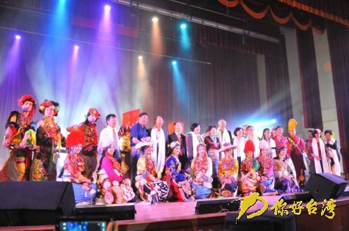 四川民族歌舞赴臺交流團在彰化舉行第四場巡演,圖為演出結(jié)束后交流團成員合影。(你好臺灣網(wǎng) 圖)