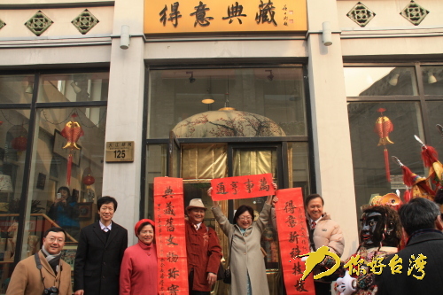 “得意典藏”商戶在自家門前張貼由兩岸書法家共同創(chuàng)作的春聯(lián)作品(你好臺(tái)灣網(wǎng) 陳靜 攝)