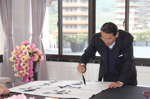 程茂全將現場創作的書法作品贈送給佛光山佛陀紀念館。(中國臺灣網 李婷婷 攝)