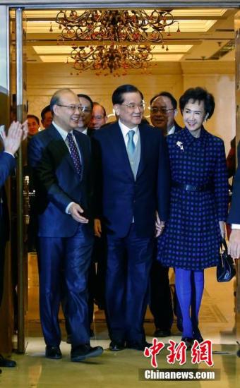2月19日,北京大學為中國國民黨榮譽主席連戰舉辦名譽教授授予儀式,完成該校2005年頒贈名譽教授給連戰的程序。圖為北大校長王恩哥(左)陪同連戰夫婦入場。中新社發 張浩 攝