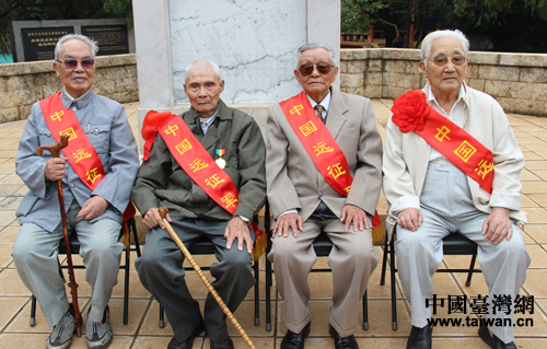 中國遠征軍抗戰(zhàn)老兵,右起依次為:王惠生(90歲)、萬云鵬(93歲)、肖朝青(101歲)、顏嘉銘(98歲)。(中國臺灣網 王文英攝)