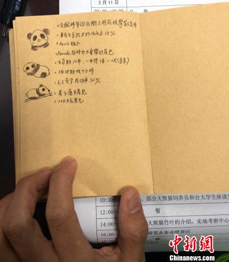 2月10日,臺(tái)大學(xué)生陳宇威在聽(tīng)課記錄本上畫(huà)了許多大熊貓的各種動(dòng)態(tài)。 張麗君 攝