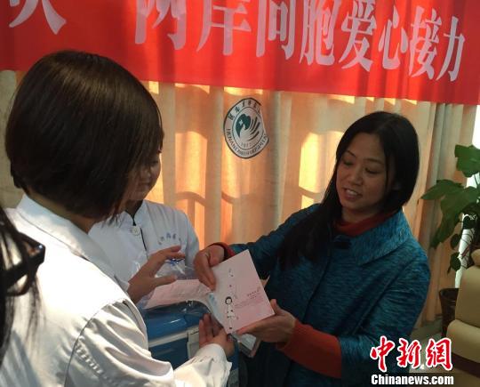 圖為河南省腫瘤醫院中心試驗室主任范瑞華,將來自臺灣的造血干細胞交接給主任醫師符粵文!熂t壘 攝