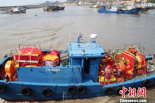 中新網福州2月16日電 (許琳晶)16日,春光明媚,福州連江黃岐碼頭熱鬧非凡。上午9點半臺籍貨輪“承順號”緩緩駛來。今年第十四屆“兩馬同春鬧元宵”活動福州馬尾區贈送的35組規格多樣的花燈在這里運往馬祖。
