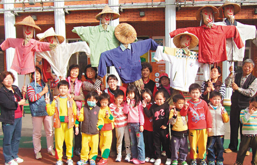臺灣觀音鄉塔腳村一群阿公、阿婆志工跳稻草人舞打敗專業舞蹈班隊,獲競賽冠軍,昨天表演給幼兒園小朋友看,趣味十足。記者賈寶楠/攝影 圖片來源:聯合新聞網
