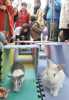 “噗啰,快到這里來!贝苟魇┩绵蹎魬鹞灏俟侄膛芨傎悾瑒撓聝擅肫呷芽,現場一片歡呼。不少飼主在競賽隧道的另一頭以零食、飼料、牧草等誘拐愛兔向前沖,只見兔子悠哉逛大街,或直接在隧道中玩起“折返跑”,令飼主相當懊惱。