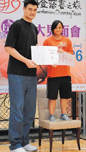 “哇!好高,真的是巨人!”身高只到姚明腰部的桃源中學一年級女學生杜儷馨,代表上臺致贈卡片時,特地搬了張椅子墊高,畫面很有趣。
