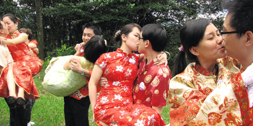 七夕情人節,寧波市20對新人情定日月潭,還在植樹紀念后,由新郎抱起身著旗袍的新娘熱情擁吻,羨煞旁人。