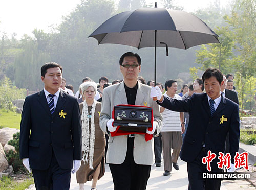 9月12日,臺(tái)灣著名作家柏楊骨灰在河南新鄭福壽園陵園下葬,實(shí)現(xiàn)了柏楊希望百年之后能夠葉落歸根,安息在中原故土的生前遺愿。圖為柏楊兒子郭本城移靈父親骨灰前往墓區(qū)。中新社記者 王中舉 攝