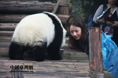 中國臺灣網10月20日成都消息 新近當選“熊貓守護使”的臺大美女模特王郁文在走馬上任之初便活動不斷。19日上午,王郁文出現在成都大熊貓繁育研究基地內部,與熊貓來了一次“親密接觸”。