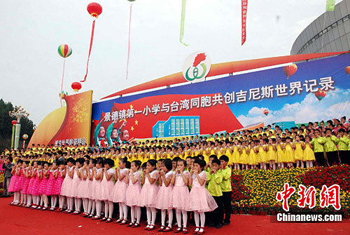 10月19日,來自臺灣的演奏家與景德鎮第一小學的小學生共831人,在世界瓷都景德鎮同時吹響陶笛,創造了奧卡利那笛(陶笛)演奏人數最多的世界吉尼斯紀錄。當天下午,809名大陸小學生與22名臺灣陶笛演奏家同臺吹奏歌曲《愛我中華》和《高山青》,演奏經英國世界吉尼斯總部官員現場認證,成功打破此前由日本創造的650人的陶笛演奏世界紀錄。劉占昆 攝