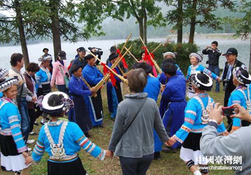 臺(tái)灣媒體采訪團(tuán)與當(dāng)?shù)孛缱迦嗣褚黄鹛J笙長鼓舞(圖片來源:貴定縣臺(tái)辦)