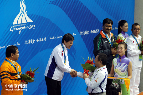 中華臺北選手郭柏成摘得廣州亞運會男子美式8球單打金牌。圖為郭柏成領獎。(中國臺灣網 鐘寶華 攝)