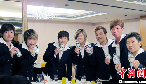 11月29日晚,臺灣有關方面在臺北為參加2010年第16屆廣州亞運會的中華臺北體育代表團舉行慶功餐會。會上,該次亞運上的中華臺北金銀銅牌全體得主分別獲贈由臺灣大洋金幣公司提供的廣州亞運主題金銀紀念幣和熊貓團團圓圓紀念銀幣,共217枚總值80萬多元新臺幣。圖為運動員在展示受贈的紀念幣。