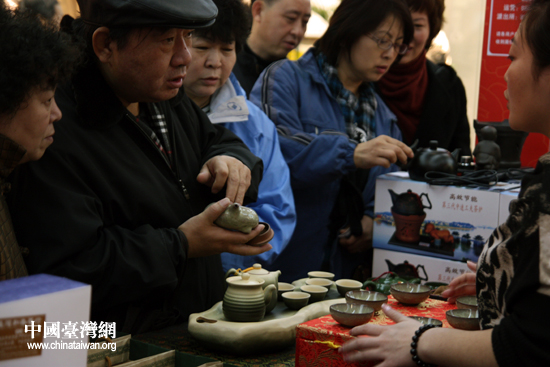 “臺灣商品大集”今天在北京金源新燕莎MALL正式開展。圖為市民在茶具展位前。(中國臺灣網 張弛 攝)