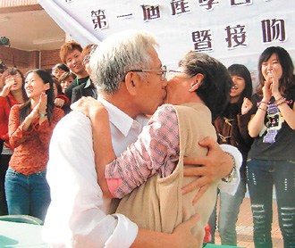 有趣的是,看到年輕人上演瘋狂接吻秀,“樂齡大學”(老年大學)76歲學員林勇吉、林美娥夫婦和64歲學員鄒永全、王龢芬夫婦,也上臺擁吻。林勇吉吻后笑說:“可惜今天沒有充電。”鄒永全則說,自己是第一次在公眾場合接吻。