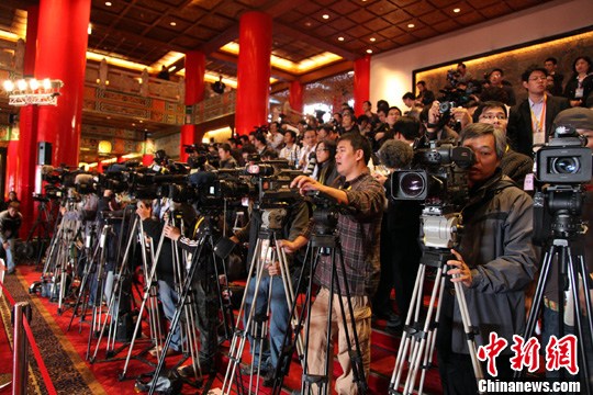 20日,來自國際、大陸、臺、港、澳的五百多名記者在臺北圓山飯店采訪兩岸兩會第六次會談。