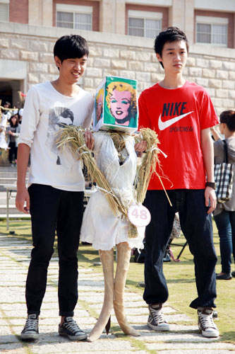 據(jù)悉,稻草人造型五花八門,有的扎成栩栩如生國(guó)際巨星邁克爾·杰克遜、瑪麗蓮·夢(mèng)露、卡通人物超人等立體造型稻草人,還有色彩艷麗大膽的搖滾稻草人、造型俏皮的可愛稻草人,最后由視覺傳達(dá)系1年級(jí)的學(xué)生林素瑄等人的“失落的世界”作品勝出,獲得首獎(jiǎng)。