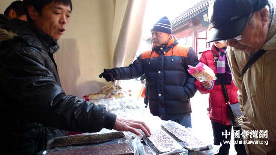 魚丸、茶葉、高粱酒;豆干、年糕、鳳梨酥,除了這些大家耳熟能詳?shù)陌槭侄Y,包括腐乳、XO醬料、米血糕、魚松、肉松等調(diào)味品也應(yīng)有盡有。雖然開街當(dāng)天北京氣溫仍舊在冰點以下,但設(shè)于室外的攤鋪讓市民們找到了一種舊時“辦年貨”的味道。