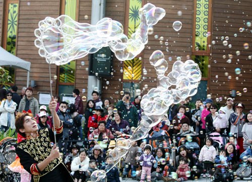 夢(mèng)想小丑劇團(tuán)22日在臺(tái)北花博會(huì)新生園區(qū)的夢(mèng)想庭園,演出“歡樂魔法泡泡秀”,讓參觀民眾體驗(yàn)泡泡的造型之美。