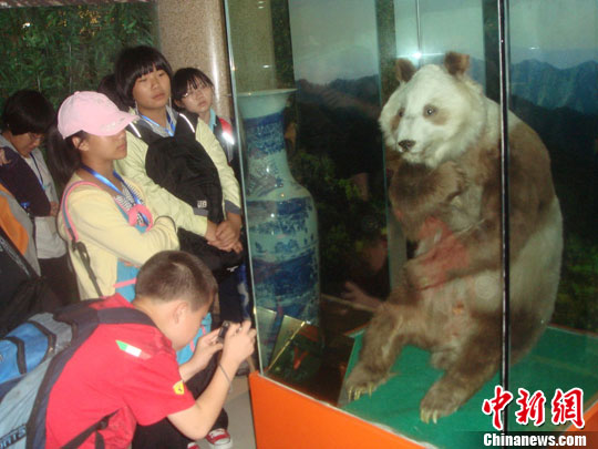 8月1日,“2011兩岸中學生自然探索夏令營”的35名營員來到位于秦嶺深處的陜西省佛坪縣,近距離與大熊貓“親密接觸”。圖為營員們參觀有記載以來世界上第一只棕白相間的大熊貓“丹丹”的標本。張一辰 攝