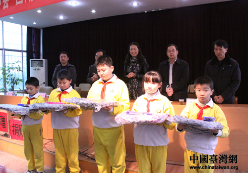 西湖社區(qū)貧困家庭學(xué)生代表接受捐贈(zèng)。(貴陽市臺(tái)辦 王康 攝)