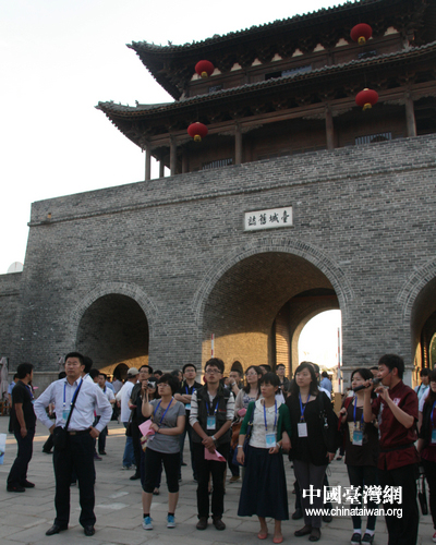 第八屆中國網(wǎng)絡(luò)媒體山東行西線采訪記者們?cè)谂_(tái)兒莊古城參觀。(中國臺(tái)灣網(wǎng) 郭瑩瑩 攝)