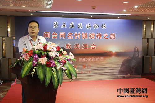 來自福建泉州市晉江安平鎮的代表張勝利在“閩臺同名鄉鎮續緣之旅啟動儀式”上致詞(中國臺灣網記者 蕪同 攝)