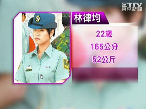 這位戴著軍帽、皮膚白皙的女兵站在司令臺旁,讓人想不注意都難,因為她有張明星臉。這位女兵名叫林律均,今年22歲,身高165公分、體重52公斤,從花蓮家商畢業(yè)后入伍從軍,第一次露面就因為長相甜美備受矚目,讓大家差點忘了當天是來參觀美侖營區(qū)的。