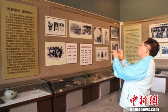 臺灣新北市體育總會執行長傅朝華在用手機拍攝“西安事變 逼蔣抗日”史料。 李芳華 攝