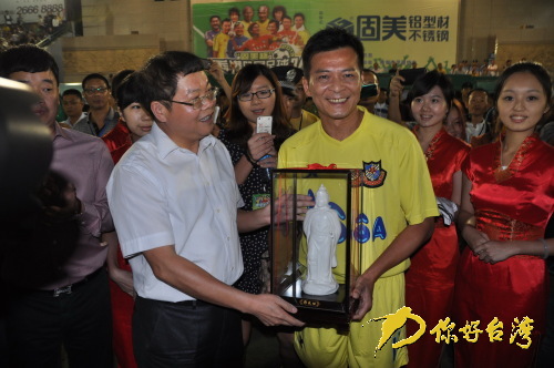 黃日華代表香港明星球隊(duì)接贈(zèng)紀(jì)念品