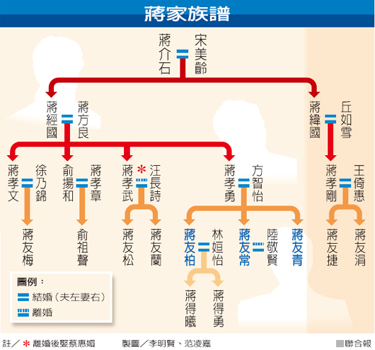 蔣家基因優良,又有大家風度,后代子孫多俊男美女。但吸引媒體關注的,除了蔣家第四代的緋聞軼事,亦有蔣家內部的齟齬。早年蔣方良猶在時,蔣孝嚴與蔣方智怡在國民黨內的互動就相當冷淡。一個求認同,一個認正統,爭的就是身為蔣家人的意氣。蔣家發展到如今,還留在臺灣政壇的也恰好只剩這兩位。某種程度上,現在提到“蔣家人”,一般人首先想到的還是這兩支。