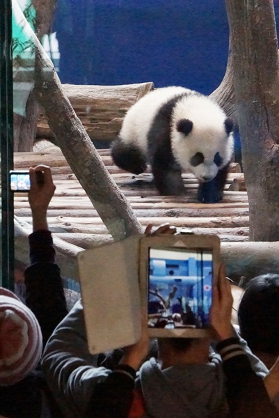 動物園大門在9時開啟,正式迎接“圓仔”亮相的歷史性一刻。許多游客拔腿狂奔,跑向大貓熊館。9時10分,“圓仔”正式和大家見面。