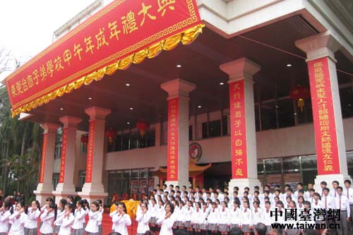 中國臺(tái)灣網(wǎng)4月9日東莞消息 日前,由廣東省臺(tái)辦及廣東省教育廳指導(dǎo),廣東省海峽兩岸交流促進(jìn)會(huì)、廣東省高等教育學(xué)會(huì)、臺(tái)灣高級(jí)中等學(xué)校校長協(xié)會(huì)、東莞臺(tái)商子弟學(xué)校及東莞臺(tái)商育苗教育基金會(huì)共同主辦的第三屆海峽兩岸(粵臺(tái))中等教育論壇暨東莞臺(tái)商子弟學(xué)校甲午年成年禮大典在東莞臺(tái)商子弟學(xué)校隆重舉行。來自兩岸67所中等教育學(xué)校近80位校長及省教育廳、省市臺(tái)辦相關(guān)負(fù)責(zé)人齊聚一堂,互相交流、探討如何落實(shí)中華文化傳承及創(chuàng)新教學(xué)的做法。