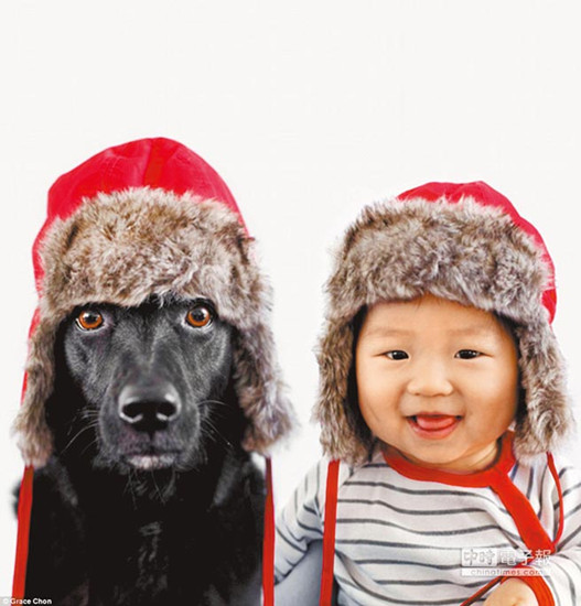 中新網(wǎng)4月28日電 據(jù)臺(tái)灣《中國時(shí)報(bào)》報(bào)道,臺(tái)灣流浪狗柔伊(Zoey)萌照躍上國際媒體。美國女?dāng)z影師葛瑞斯7年前認(rèn)養(yǎng)柔伊,日前將它與10個(gè)月大的兒子杰士伯打扮相同造型一起入鏡,真像是“人狗雙胞胎”。