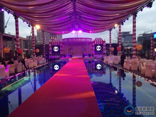 據臺灣“東森新聞”報道,周杰倫日前在英國辦完超豪華世紀婚禮,9日在臺北W Hotel補辦戶外婚禮,現場許多演藝圈大腕好友紛紛到場祝賀。而婚禮內場也隨之曝光,風格大吹俏皮馬戲團風,除了有多張小倆口甜蜜合照,紅毯架在泳池上,左右都是水,看起來相當浪漫。
