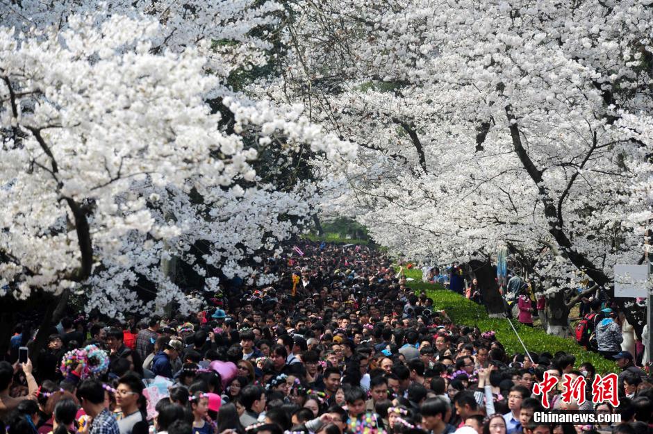 3月21日,武大櫻花盛開游客如織。當日,武大櫻花盛開的首個雙休日。長約200米的櫻花大道上1000多株櫻花競相綻放,吸引著數(shù)萬游客,使寧靜的校園變成了熱鬧的公園。中新社發(fā) 張暢 攝