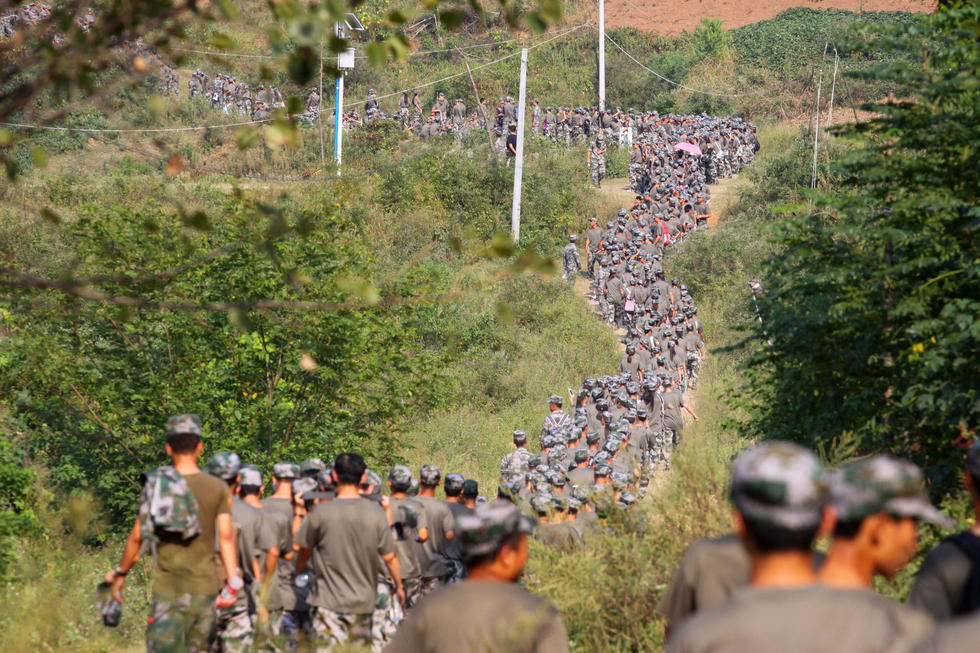 9月15日,湖北襄陽市,湖北文理學(xué)院近四千名大學(xué)一年級新生在隆中山上進行十公里拉練。