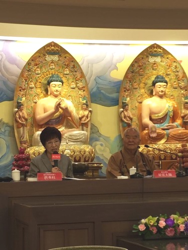 中國網(文化中國)訊:9月21日,臺灣佛光山開山宗長星云大師最新親筆著作《星云智慧》新書發布會在佛光山臺北道場舉行,星云大師特別北上,親臨開示。國民黨臺灣地區領導人參選人洪秀柱女士會前先與星云大師會面,扶著星云大師的輪椅一同進場并同臺就坐。星云大師發表講話力挺洪秀柱,這次代表國民黨出來競選2016,在黨代會上獲得大家支持,“你在我們的心目中,已經當選臺灣地區領導人了”。對于洪秀柱曾經說要做“觀世音,要救苦救難”,星云大師表示“這一句話是偉大的,我感到非常的贊嘆,非常的歡喜”、“媽祖婆是觀世音的弟子”。星云大師同時呼吁,希望臺灣和中華文化能夠接線,讓臺灣永遠與中華文化在一起,都成為佛教的信仰,讓信仰成為我們的力量。隨后,洪秀柱在致辭時表示,她非常高興能受邀出席,并得到星云大師的親筆簽名,自己“何其有幸,非常有福氣”,也謹記大師所說的“三好”、“四給”、“五和”。