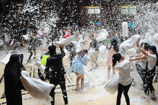 午休時,戴上面具的員工們還玩起了枕頭大戰,千古情主題酒店的大堂飄起了一場“鵝毛大雪”,戴上面具后大家不再有職位上的區別,甚至公司的總經理也加入到了這場枕頭大戰之中。每個人都不甘落后,揮起枕頭,用“柔軟的暴力”,盡情宣泄生活的壓力。