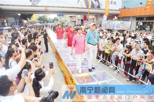 現(xiàn)場第一批走上金磚大道的市民是六對金婚鉆石婚的老人。老人們緩慢走過,圍觀的市民紛紛鼓掌喝彩。